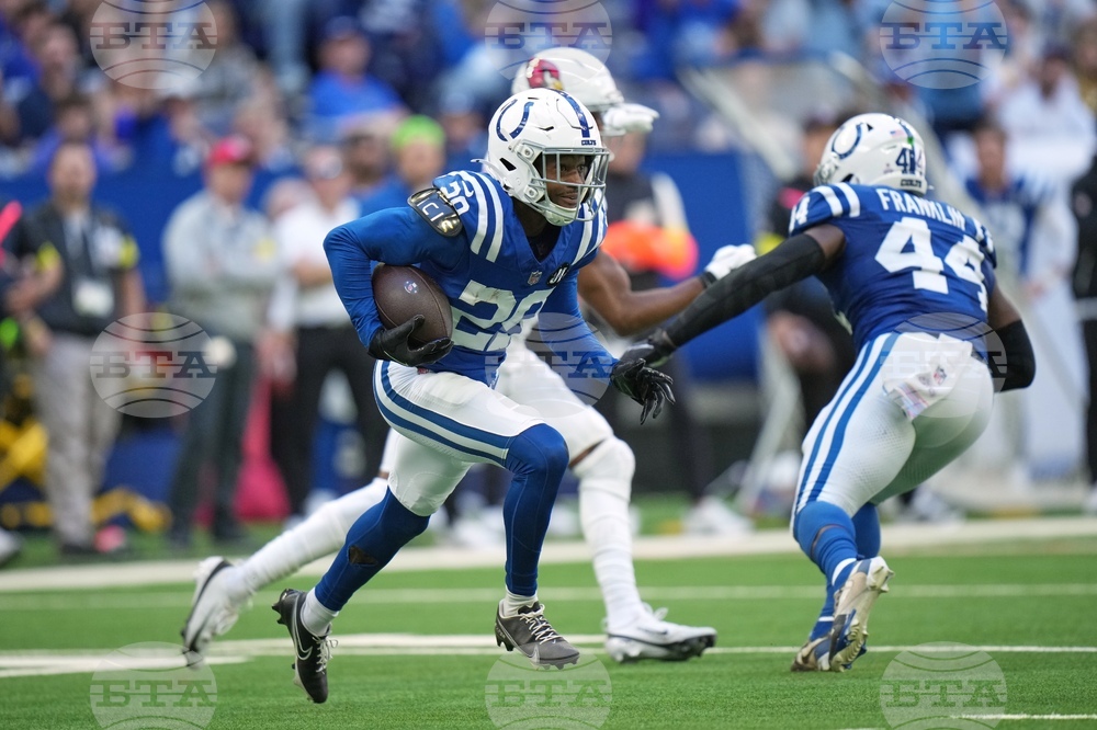 Indianapolis Colts' Mekhi Blackmon runs after intercepting a pass during the first half of an NFL football game against the Arizona Cardinals Sunday, Oct. 12, 2025, in Indianapolis. (AP Photo/AJ Mast)