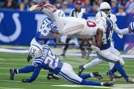 Indianapolis Colts' Khalil Herbert is stopped in front of Arizona Cardinals' Jordan Burch during the first half of an NFL football game Sunday, Oct. 12, 2025, in Indianapolis. (AP Photo/AJ Mast)