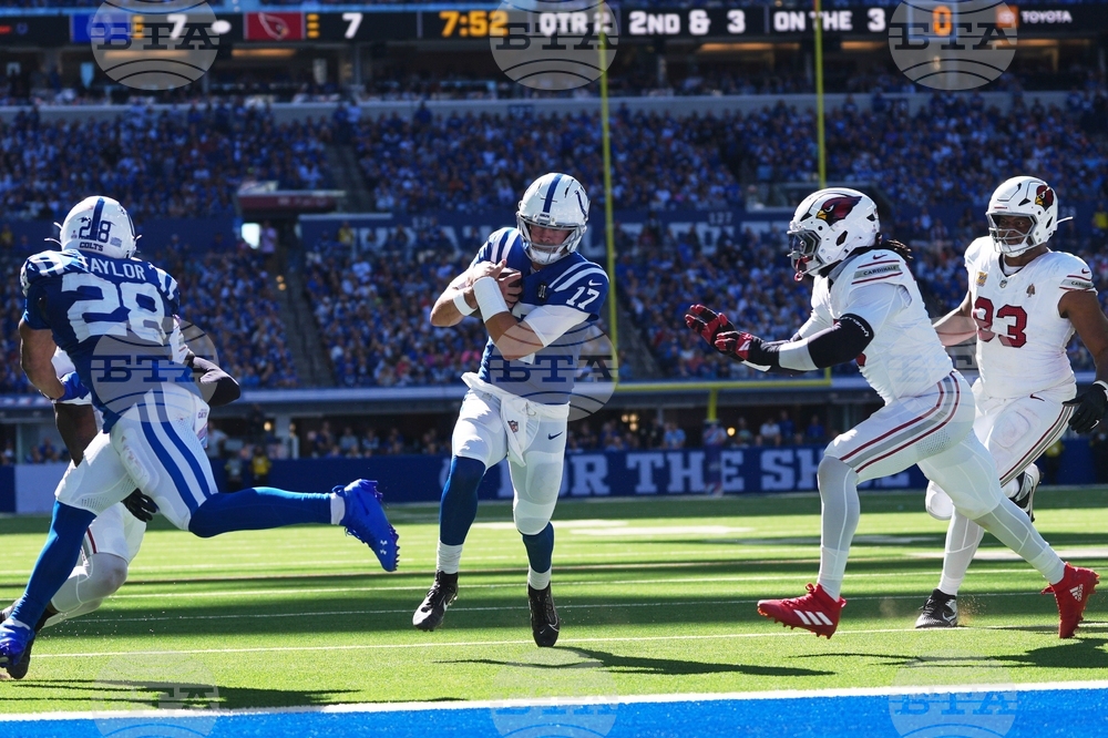 Indianapolis Colts' Daniel Jones runs for a touchdown during the first half of an NFL football game against the Arizona Cardinals Sunday, Oct. 12, 2025, in Indianapolis. (AP Photo/AJ Mast)