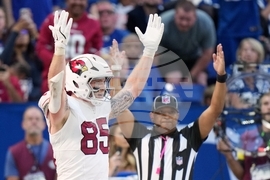 Arizona Cardinals' Trey McBride celebrates a first down during the first half of an NFL football game against the Indianapolis Colts Sunday, Oct. 12, 2025, in Indianapolis. (AP Photo/Michael Conroy)