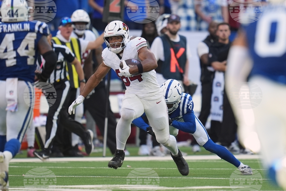 Arizona Cardinals' Bam Knight runs during the second half of an NFL football game against the Indianapolis Colts Sunday, Oct. 12, 2025, in Indianapolis. (AP Photo/AJ Mast)