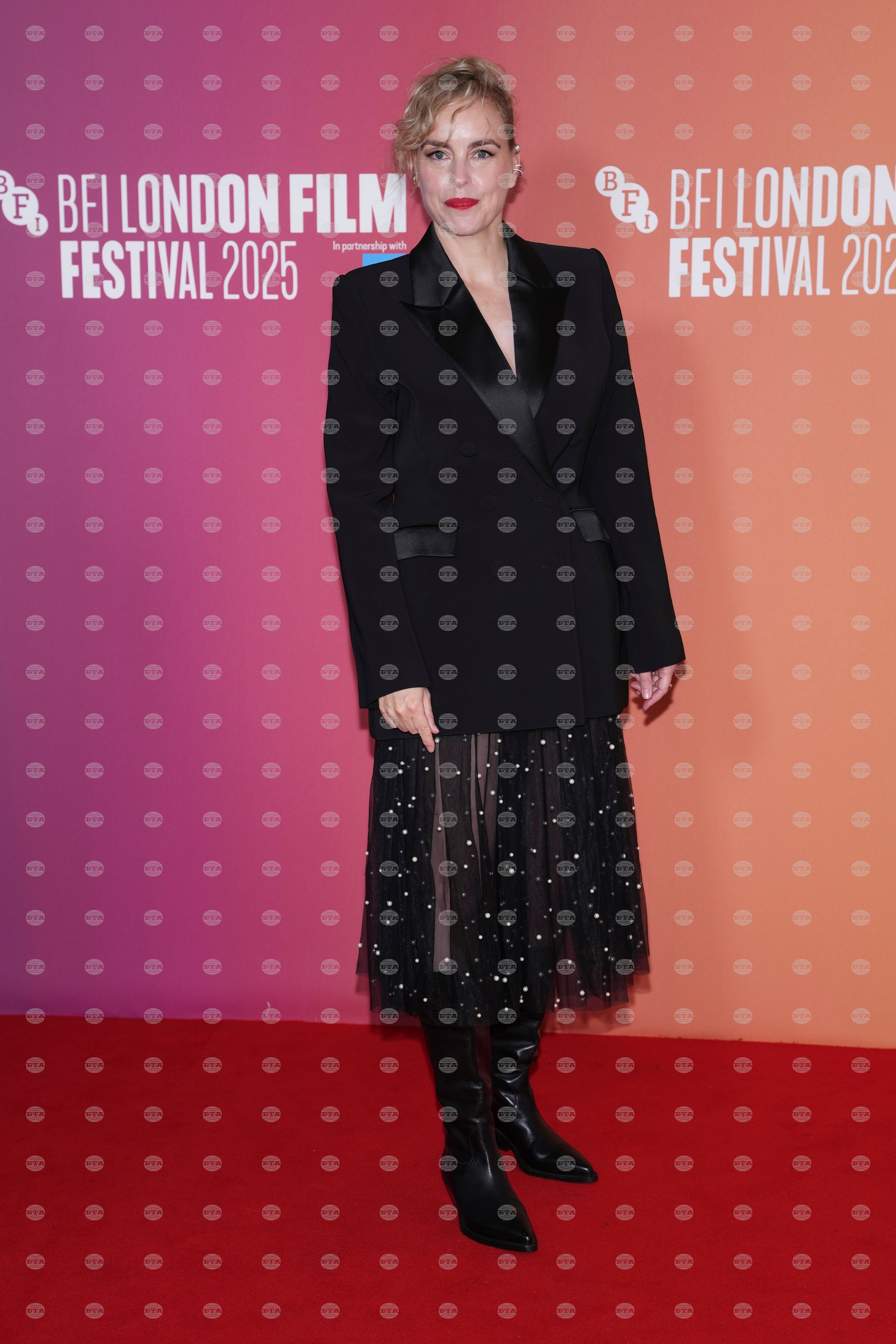 Nina Hoss poses for photographers upon arrival at the premiere of the film "Hedda" during the London film festival in London, Sunday, Oct. 12, 2025. (Photo by Scott A Garfitt/Invision/AP)