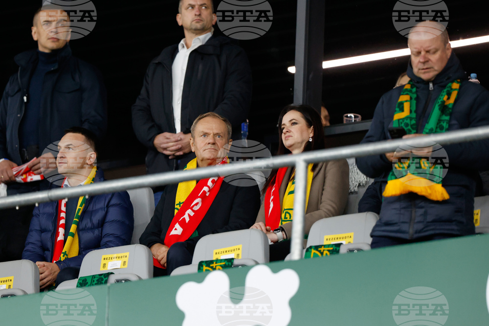 Poland's Prime Minister Donald Tusk, centre, and Lithuania's Prime Minister Inga Ruginiene, centre right, wait for the start of the World Cup 2026 group G qualifying soccer match between Lithuania and Poland at Darius and Girenas stadium in Kaunas, Lithuania, Sunday, Oct. 12, 2025. (AP Photo/Mindaugas Kulbis)