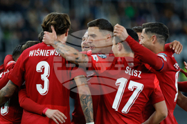 Poland players celebrate after Poland's Sebastian Szymanski scored his side's opening goal during a World Cup 2026 group G qualifying soccer match between Lithuania and Poland at Darius and Girenas stadium in Kaunas, Lithuania, Sunday, Oct. 12, 2025. (AP Photo/Mindaugas Kulbis)
