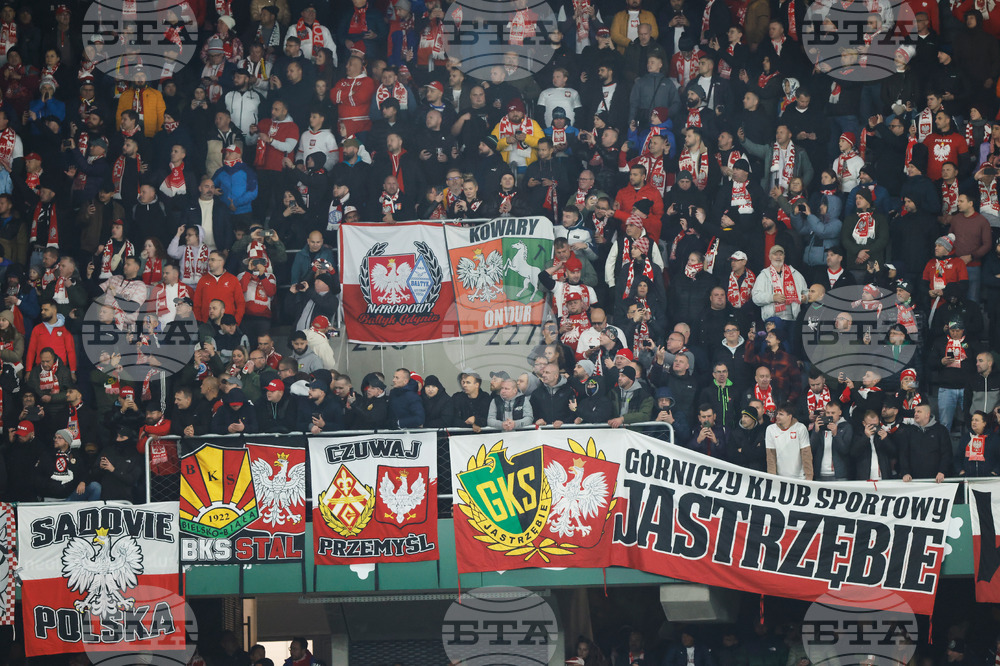 Fans of Poland team cheer prior to a World Cup 2026 group G qualifying soccer match between Lithuania and Poland at Darius and Girenas stadium in Kaunas, Lithuania, Sunday, Oct. 12, 2025. (AP Photo/Mindaugas Kulbis)