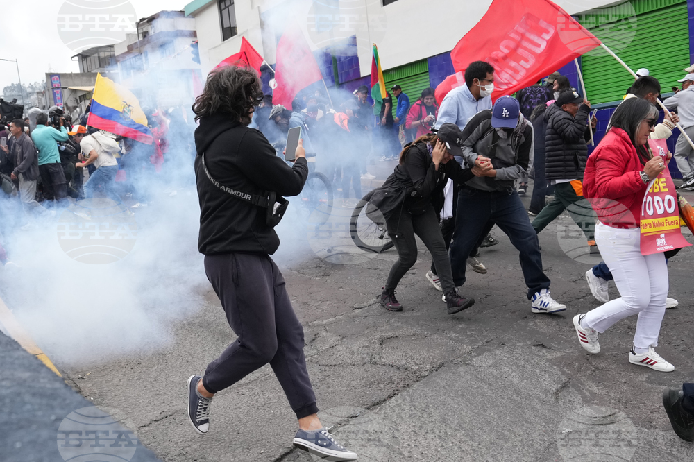 Demonstrators run from tear gas during a protest against President Daniel Noboa's government, in Quito, Ecuador, Sunday, Oct. 12, 2025. (AP Photo/Dolores Ochoa)