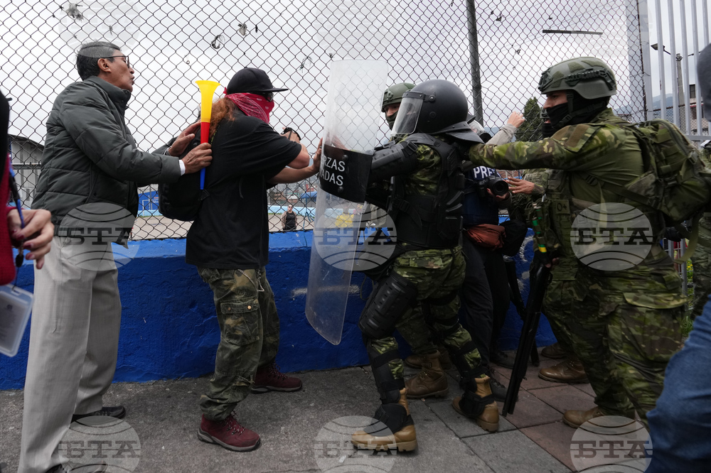 Protesters face off with soldiers during a protest against President Daniel Noboa's government, in Quito, Ecuador, Sunday, Oct. 12, 2025, (AP Photo/Dolores Ochoa)
