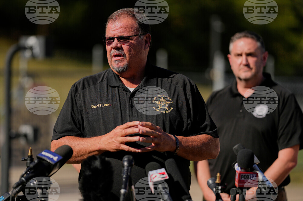 Humphreys County Sheriff Chris Davis, center, speaks about the blast at Accurate Energetic Systems during a news conference, Sunday, Oct. 12, 2025, in McEwen, Tenn. (AP Photo/George Walker IV)