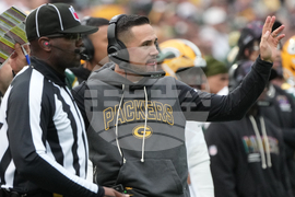 Green Bay Packers head coach Matt Lafleur walks the sidelines in the first half of an NFL football game against the Cincinnati Bengals, Sunday, Oct. 12, 2025, in Green Bay, Wis. (AP Photo/Mike Roemer)
