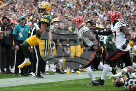 Green Bay Packers wide receiver Savion Williams (83) runs on a kick off return against the Cincinnati Bengals in the first half of an NFL football game, Sunday, Oct. 12, 2025, in Green Bay, Wis. (AP Photo/Morry Gash)