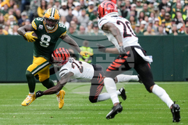 Green Bay Packers running back Josh Jacobs (8) runs against Cincinnati Bengals cornerback Daxton Hill (23) in the first half of an NFL football game, Sunday, Oct. 12, 2025, in Green Bay, Wis. (AP Photo/Morry Gash)