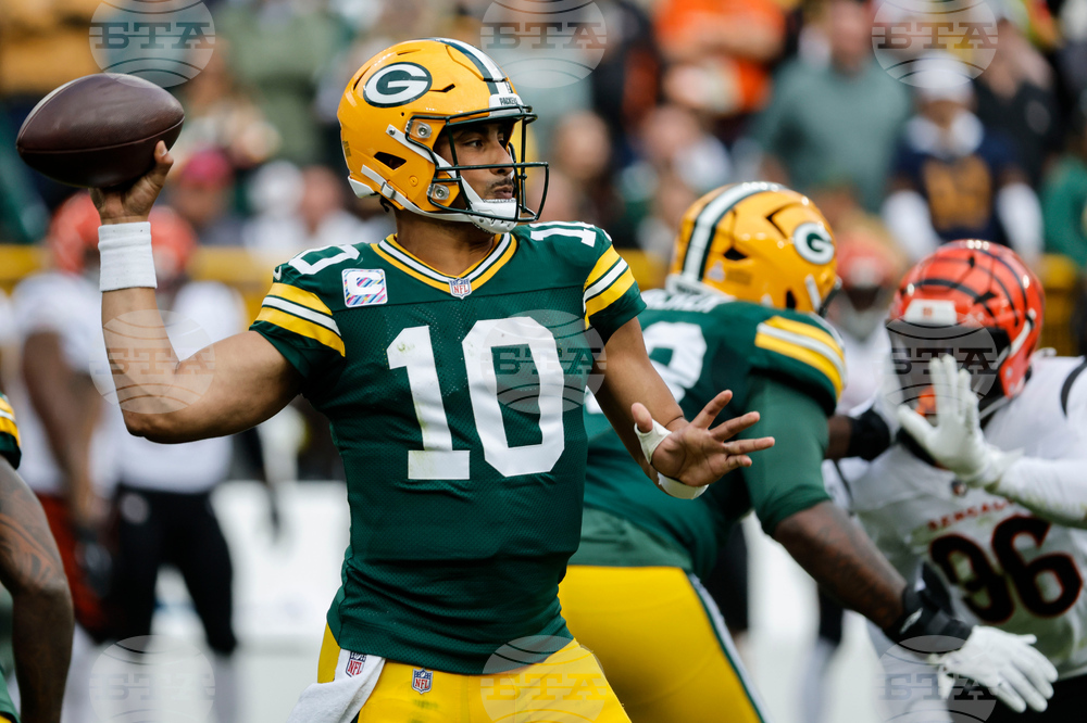 Green Bay Packers quarterback Jordan Love (10) passes against the Cincinnati Bengals in the first half of an NFL football game, Sunday, Oct. 12, 2025, in Green Bay, Wis. (AP Photo/Morry Gash)