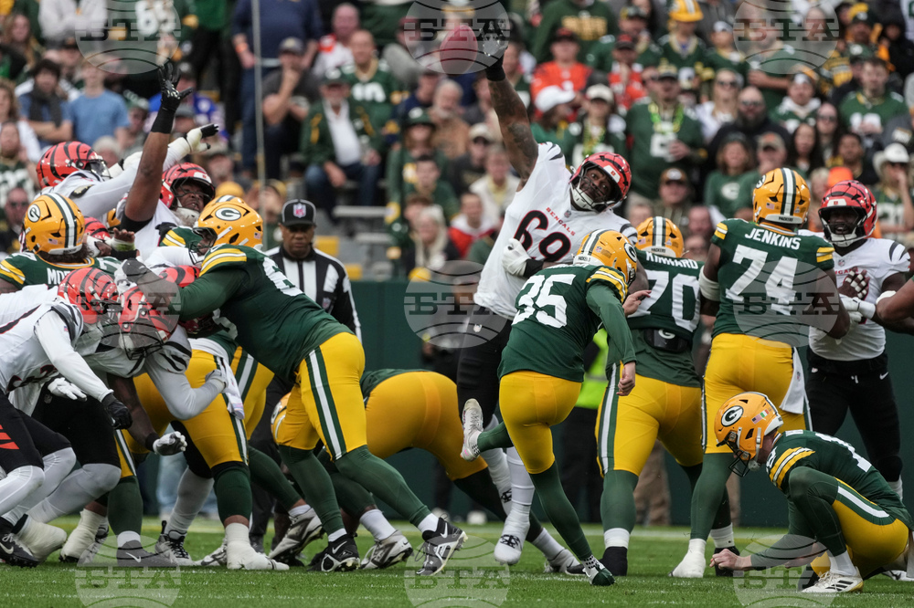 Green Bay Packers' Lucas Havrisik kicks a field goal against the Cincinnati Bengals in the first half of an NFL football game, Sunday, Oct. 12, 2025, in Green Bay, Wis. (AP Photo/Morry Gash)