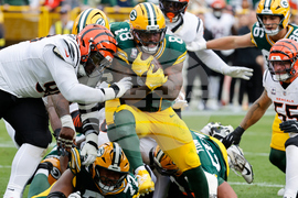 Green Bay Packers running back Josh Jacobs (8) runs against Cincinnati Bengals linebacker Barrett Carter (49) in the first half of an NFL football game, Sunday, Oct. 12, 2025, in Green Bay, Wis. (AP Photo/Mike Roemer)