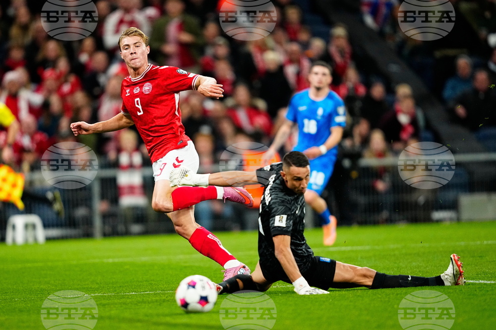Denmark's Rasmus Hoejlund, left, scores the opening goal during the World Cup group C qualification match between Denmark and Greece at Parken stadium in Copenhagen, Sunday, Oct. 12, 2025. (Mads Claus Rasmussen/Ritzau Scanpix via AP)