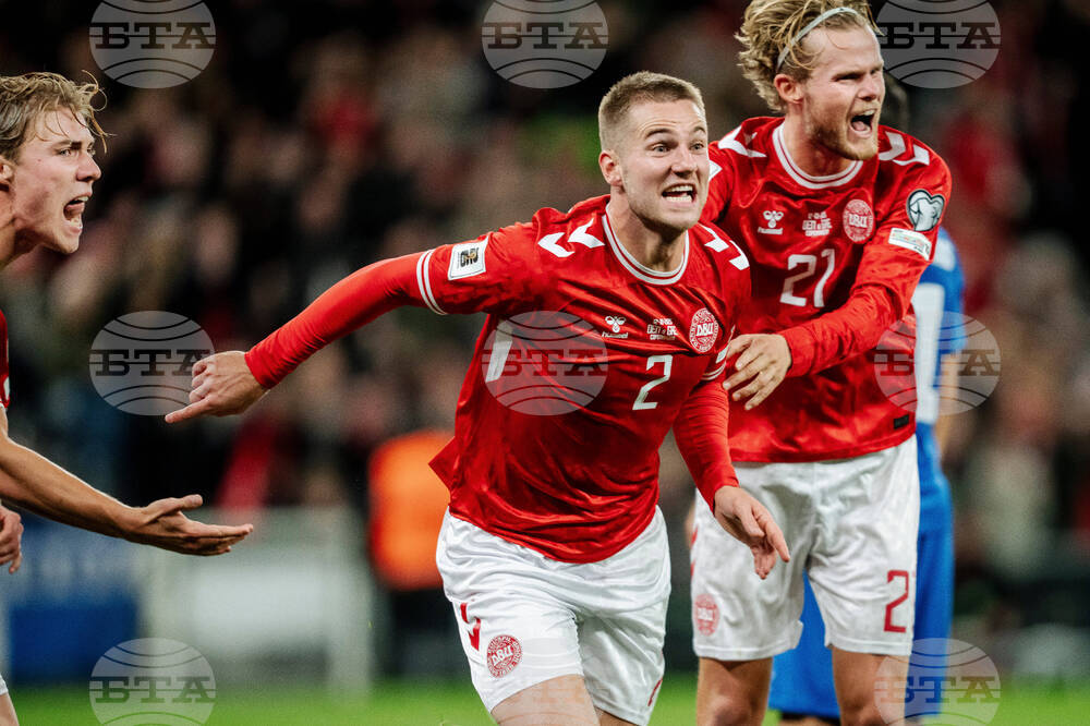 Denmark's Joachim Andersen, left, celebrates with teammates after scoring his side's second goal during the World Cup group C qualification match between Denmark and Greece at Parken stadium in Copenhagen, Sunday, Oct. 12, 2025. (Mads Claus Rasmussen/Ritzau Scanpix via AP)