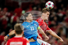 Denmark's Victor Froholdt, top, and Greece's Dimitris Kourbelis, centre right, challenge for the ball during the World Cup group C qualification match between Denmark and Greece at Parken stadium in Copenhagen, Sunday, Oct. 12, 2025. (Mads Claus Rasmussen/Ritzau Scanpix via AP)
