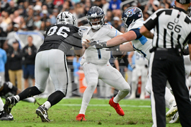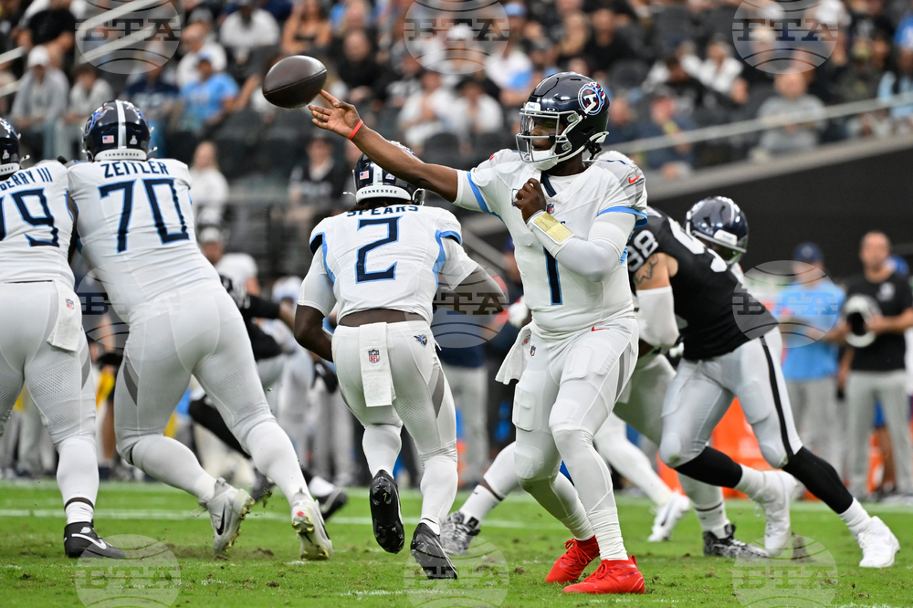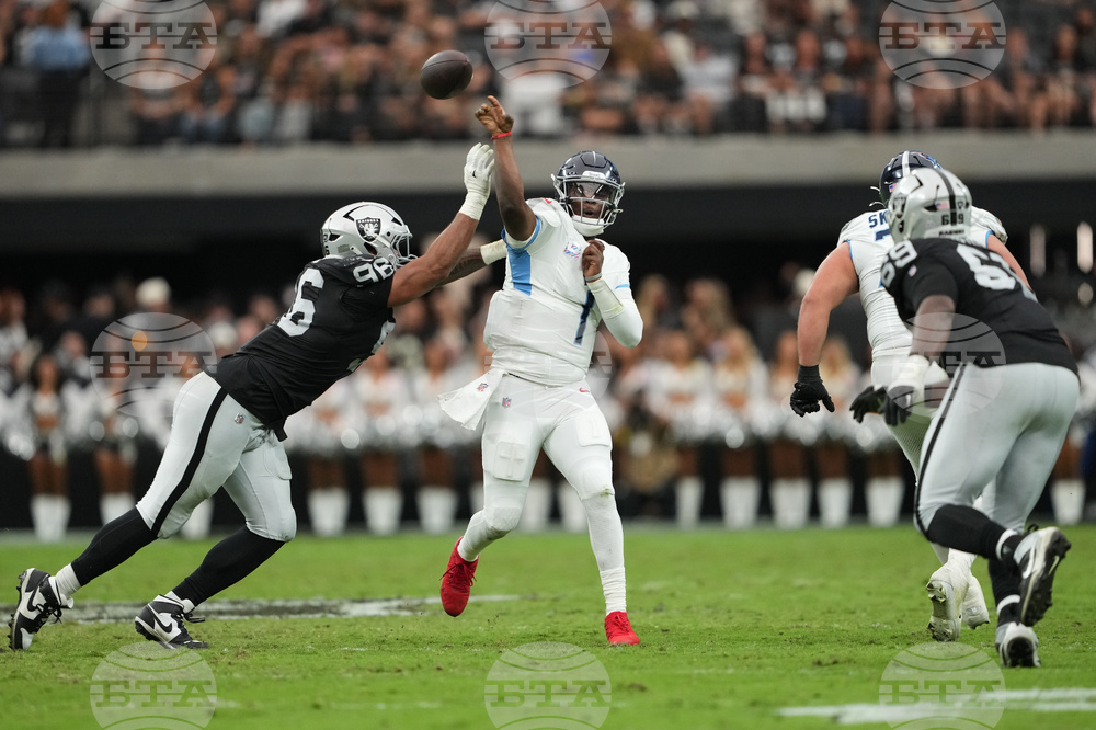 Tennessee Titans quarterback Cam Ward (1) throws against the Las Vegas Raiders during the first half of an NFL football game, Sunday, Oct. 12, 2025, in Las Vegas. (AP Photo/David Becker)