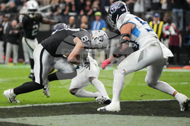 Las Vegas Raiders tight end Michael Mayer (87) scores a touchdown against Tennessee Titans cornerback Roger McCreary (21) during the first half of an NFL football game, Sunday, Oct. 12, 2025, in Las Vegas. (AP Photo/David Becker)