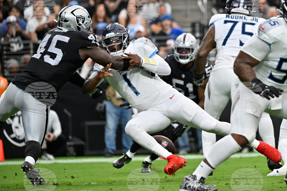 Tennessee Titans quarterback Cam Ward (1) fumbles the ball while hit by Las Vegas Raiders linebacker Devin White (45) during the first half of an NFL football game, Sunday, Oct. 12, 2025, in Las Vegas. (AP Photo/David Becker)