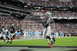 Las Vegas Raiders tight end Michael Mayer (87) scores a touchdown against the Tennessee Titans during the first half of an NFL football game, Sunday, Oct. 12, 2025, in Las Vegas. (AP Photo/Rick Scuteri)