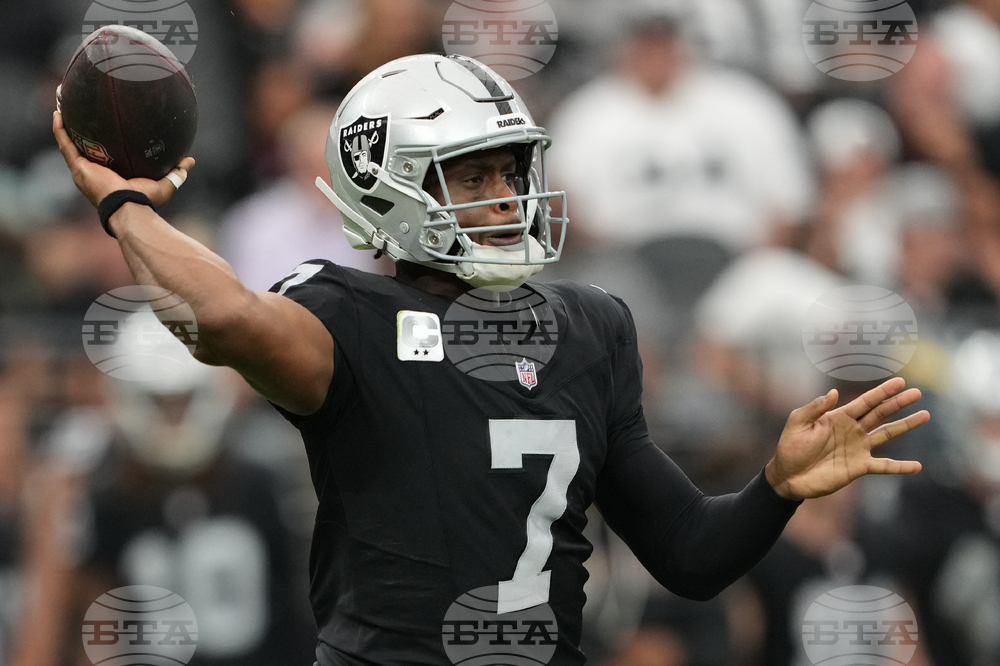 Las Vegas Raiders quarterback Geno Smith (7) looks to throw against the Tennessee Titans during the first half of an NFL football game, Sunday, Oct. 12, 2025, in Las Vegas. (AP Photo/David Becker)
