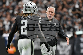 Las Vegas Raiders head coach Pete Carroll celebrates after Las Vegas Raiders running back Ashton Jeanty (2) scored a touchdown against the Tennessee Titans during the second half of an NFL football game, Sunday, Oct. 12, 2025, in Las Vegas. (AP Photo/David Becker)