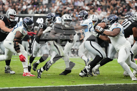 Las Vegas Raiders defensive tackle Leki Fotu (95) recovers a fumble by Tennessee Titans quarterback Cam Ward (1) during the second half of an NFL football game, Sunday, Oct. 12, 2025, in Las Vegas. (AP Photo/Rick Scuteri)