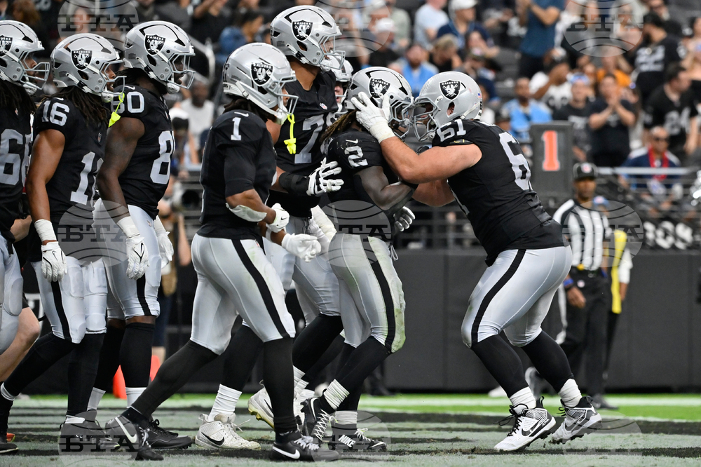 Las Vegas Raiders guard Jordan Meredith (61) celebrates after Las Vegas Raiders running back Ashton Jeanty (2) scored a touchdown against the Tennessee Titans during the second half of an NFL football game, Sunday, Oct. 12, 2025, in Las Vegas. (AP Photo/David Becker)
