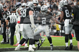 Las Vegas Raiders running back Ashton Jeanty (2) runs for a touchdown against the Tennessee Titans during the second half of an NFL football game, Sunday, Oct. 12, 2025, in Las Vegas. (AP Photo/Rick Scuteri)