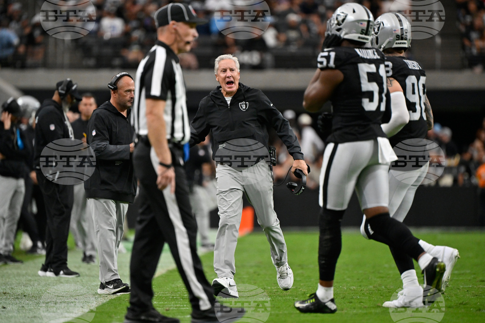 Las Vegas Raiders head coach Pete Carroll reacts after a play against the Tennessee Titans during the second half of an NFL football game, Sunday, Oct. 12, 2025, in Las Vegas. (AP Photo/David Becker)