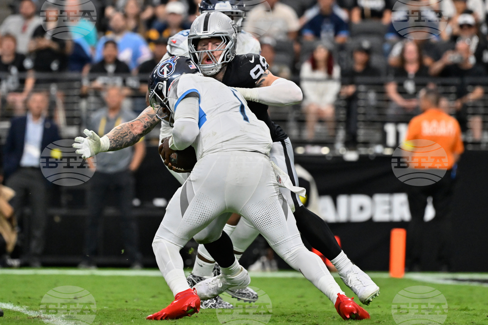 Las Vegas Raiders defensive tackle Leki Fotu (95) sacks Tennessee Titans quarterback Cam Ward (1) during the second half of an NFL football game, Sunday, Oct. 12, 2025, in Las Vegas. (AP Photo/David Becker)