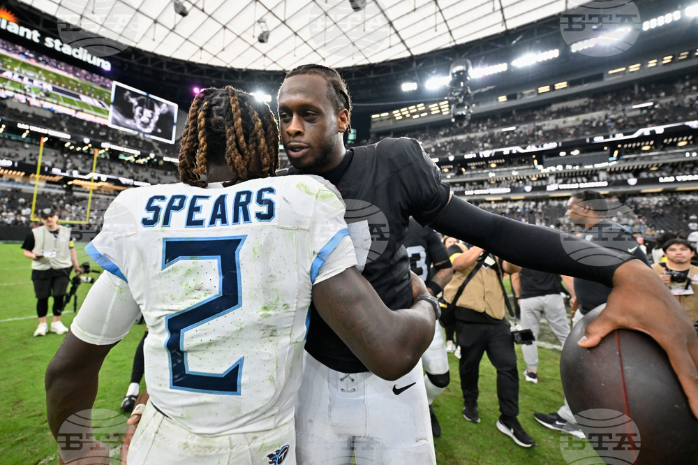 Las Vegas Raiders quarterback Geno Smith (7) embraces Tennessee Titans running back Tyjae Spears (2) after an NFL football game, Sunday, Oct. 12, 2025, in Las Vegas. (AP Photo/David Becker)