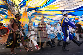 Moctezuma, represented by Gerardo Hernández Espinoza, left, La Malinche, represented by Ximena Isabel Ochoa López, center, and Hernán Cortez, represented by José Antonio Ochoa Lopez take part in a pre-Hispanic dance in the Zocalo, in Mexico City, Sunday, Oct. 12, 2025. (AP Photo/Marco Ugarte)