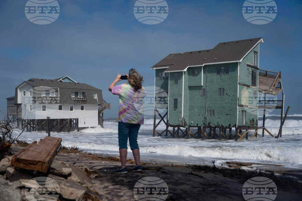 A person stands and takes photos of houses at risk of collapse in the midst of a storm, Sunday, Oct. 12, 2025, in Buxton, N.C. (AP Photo/Allison Joyce)