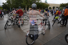Participants prepare for the Naked Bike Ride protest on Sunday, Oct. 12, 2025, in Portland, Ore. (AP Photo/Jenny Kane)