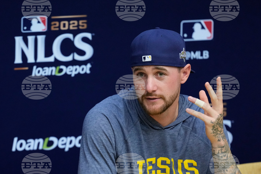 Los Angeles Dodgers pitcher Blake Snell speaks during a news conference ahead of Game 1 of baseball's National League Championship Series between the Milwaukee Brewers and the Los Angeles Dodgers on Sunday, Oct. 12, 2025, in Milwaukee. (AP Photo/Ashley Landis)