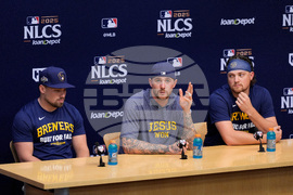 Milwaukee Brewers third baseman Caleb Durbin, second baseman Brice Turang and pitcher Chad Patrick speak during a news conference ahead of Game 1 of baseball's National League Championship Series between the Milwaukee Brewers and the Los Angeles Dodgers on Sunday, Oct. 12, 2025, in Milwaukee. (AP Photo/Ashley Landis)