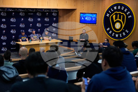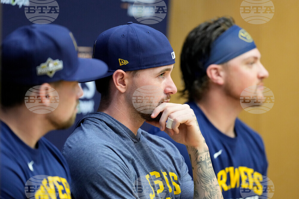 Milwaukee Brewers third baseman Caleb Durbin, second baseman Brice Turang and pitcher Chad Patrick speak during a news conference ahead of Game 1 of baseball's American League Championship Series between the Milwaukee Brewers and the Los Angeles Dodgers on Sunday, Oct. 12, 2025, in Milwaukee. (AP Photo/Ashley Landis)