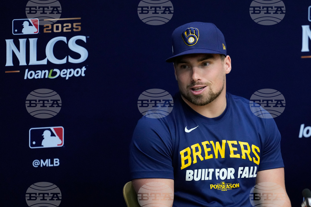 Milwaukee Brewers second baseman Brice Turang speaks during a news conference ahead of Game 1 of baseball's National League Championship Series between the Milwaukee Brewers and the Los Angeles Dodgers on Sunday, Oct. 12, 2025, in Milwaukee. (AP Photo/Ashley Landis)