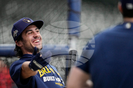Milwaukee Brewers left fielder Christian Yelich watches during batting practice ahead of Game 1 of baseball's National League Championship Series between the Milwaukee Brewers and the Los Angeles Dodgers on Sunday, Oct. 12, 2025, in Milwaukee. (AP Photo/Brynn Anderson)