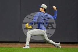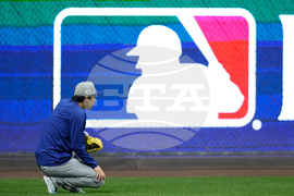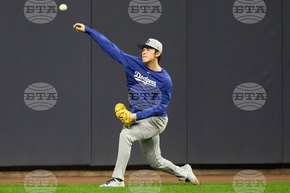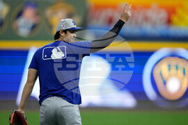 Los Angeles Dodgers pitcher Roki Sasaki throws during batting practice ahead of Game 1 of baseball's National League Championship Series between the Milwaukee Brewers and the Los Angeles Dodgers on Sunday, Oct. 12, 2025, in Milwaukee. (AP Photo/Ashley Landis)