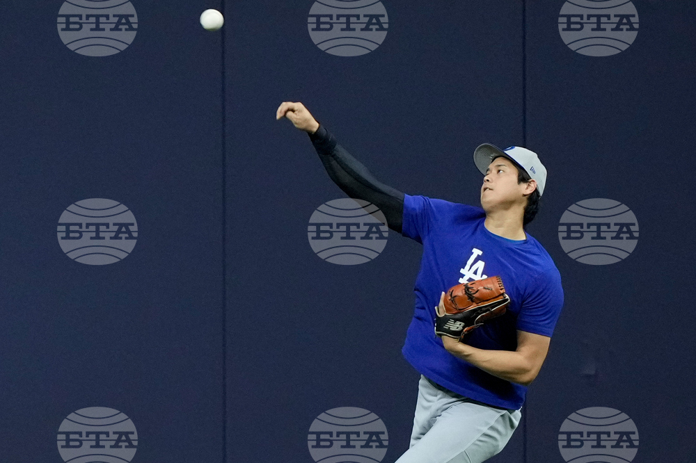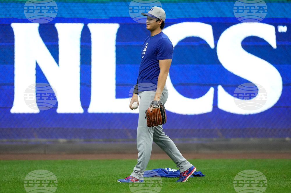 Los Angeles Dodgers' Shohei Ohtani and pitcher Yoshinobu Yamamoto warm up during batting practice ahead of Game 1 of baseball's National League Championship Series between the Milwaukee Brewers and the Los Angeles Dodgers on Sunday, Oct. 12, 2025, in Milwaukee. (AP Photo/Ashley Landis)