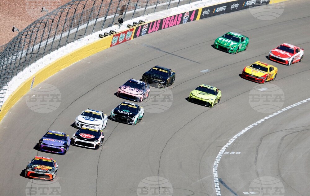 Drivers race out of Turn 4 during a NASCAR Cup Series auto race Sunday, Oct. 12, 2025, in Las Vegas. (AP Photo/Steve Marcus)