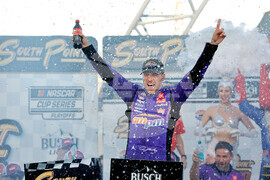Denny Hamlin celebrates in victory lane after winning a NASCAR Cup Series auto race Sunday, Oct. 12, 2025, in Las Vegas. (AP Photo/Steve Marcus)