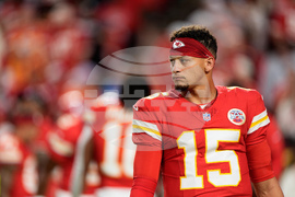 Kansas City Chiefs quarterback Patrick Mahomes pauses before an NFL football game against the Detroit Lions Sunday, Oct. 12, 2025, in Kansas City, Mo. (AP Photo/Charlie Riedel)