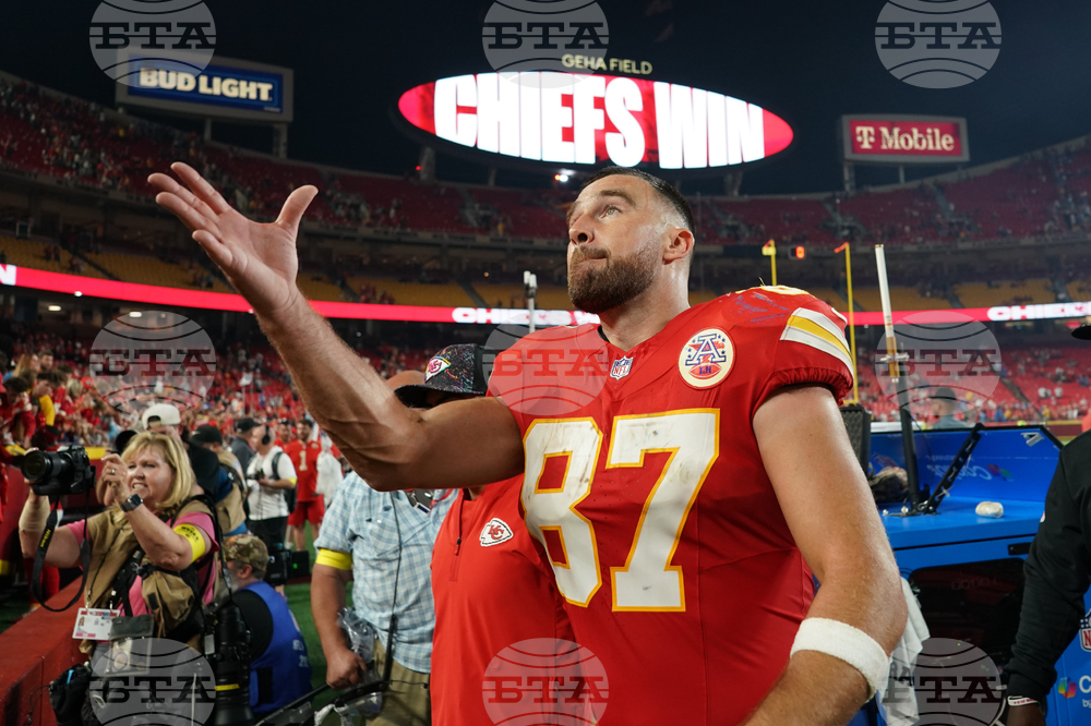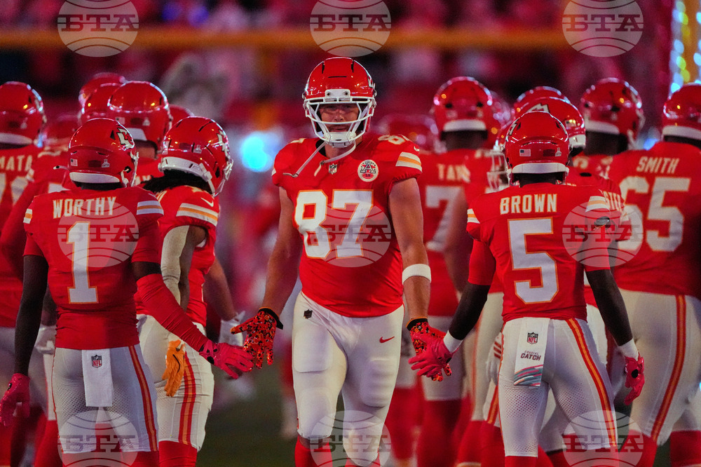 Kansas City Chiefs tight end Travis Kelce runs on the field before an NFL football game against the Detroit Lions Sunday, Oct. 12, 2025, in Kansas City, Mo. (AP Photo/Charlie Riedel)