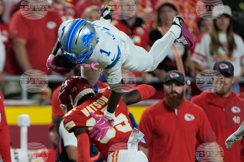 Detroit Lions wide receiver Jameson Williams (1) gains a first down as Kansas City Chiefs cornerback Jaylen Watson (35) defends during the first half of an NFL football game Sunday, Oct. 12, 2025, in Kansas City, Mo. (AP Photo/Charlie Riedel)