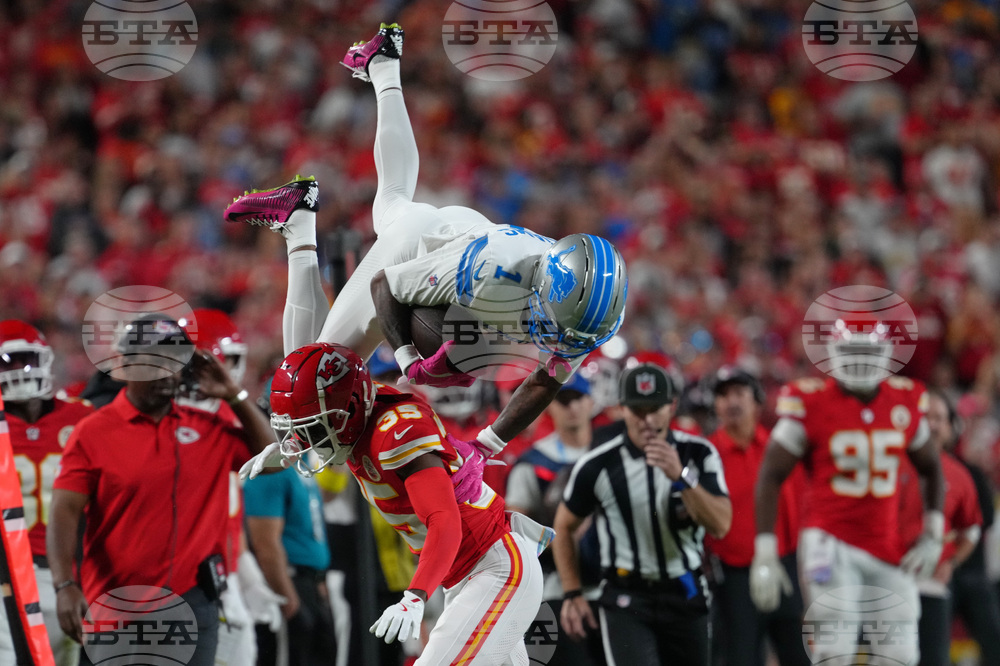 Detroit Lions wide receiver Jameson Williams (1) is tackled by Kansas City Chiefs safety Bryan Cook (6) as Chiefs cornerback Trent McDuffie (22) watches during the second half of an NFL football game Sunday, Oct. 12, 2025, in Kansas City, Mo. (AP Photo/Charlie Riedel)