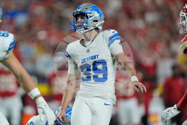 Detroit Lions safety Kerby Joseph pauses before an NFL football game against the Kansas City Chiefs Sunday, Oct. 12, 2025, in Kansas City, Mo. (AP Photo/Charlie Riedel)